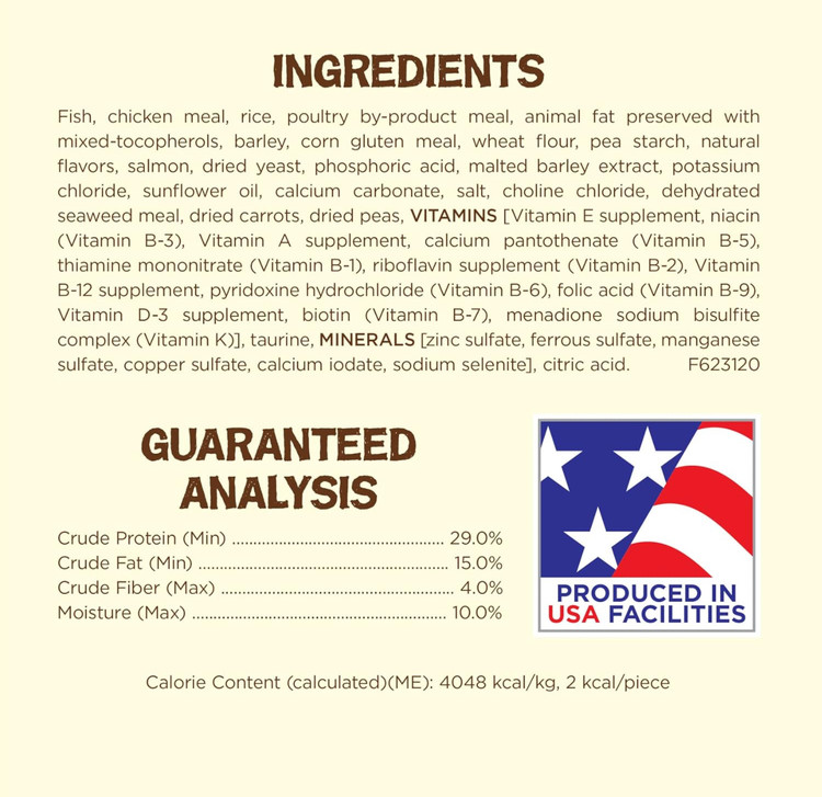 تشویقی گربه Friskies با ماهی واقعی به عنوان ماده اول و حاوی 2 کالری در هر غذا درست شده است.