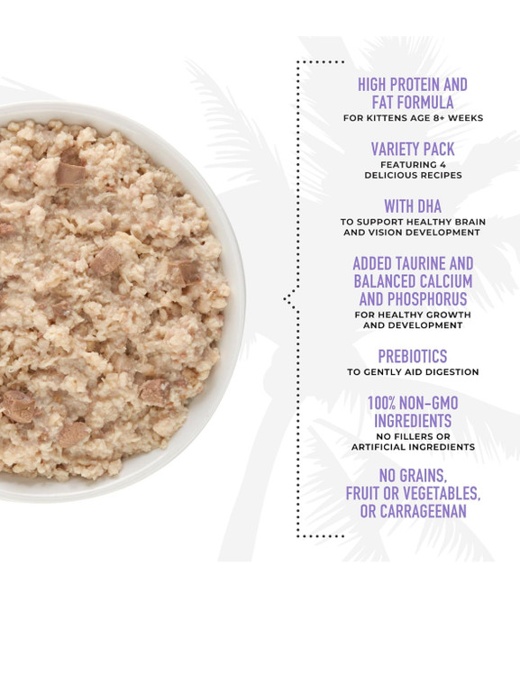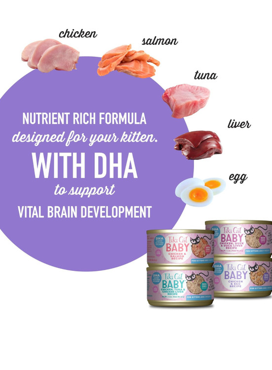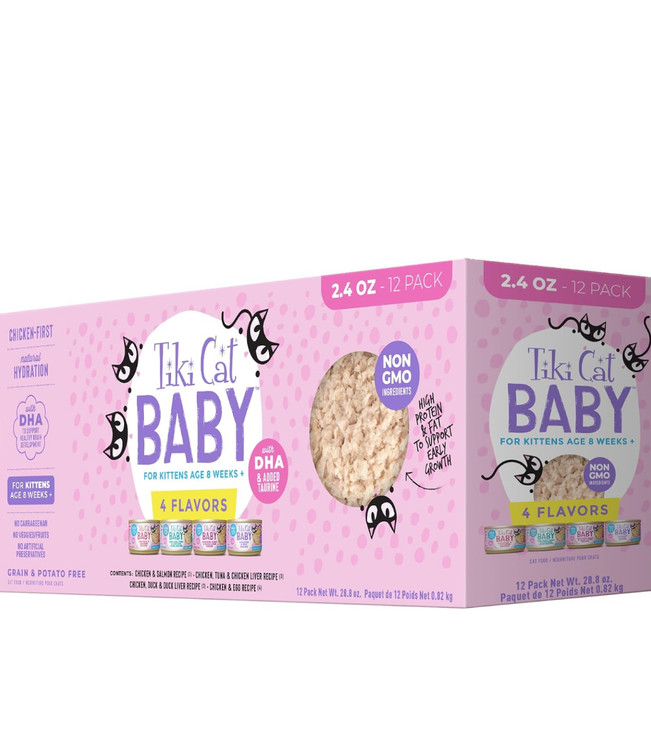 بچه گربه ها گوشتخوار به دنیا می آیند، اما نیازهای تغذیه ای بسیار خاصی نیز دارند. با افزایش انرژی، توسعه سیستم گوارشی و ایمنی، و بدن در حال رشد، آنها به تغذیه ای که فقط برای آنها طراحی شده است نیاز دارند. دستور العمل های Tiki Cat® Baby™ با پروتئین و چربی بالا، DHA، تورین اضافه شده و پری بیوتیک در فرمول نرم و خوش طعم، بهترین شروع را به بچه گربه ها می دهد. و با این بسته متنوع، بچه گربه شما می تواند از طعم های مختلف و منابع پروتئینی در هر وعده غذایی لذت ببرد!