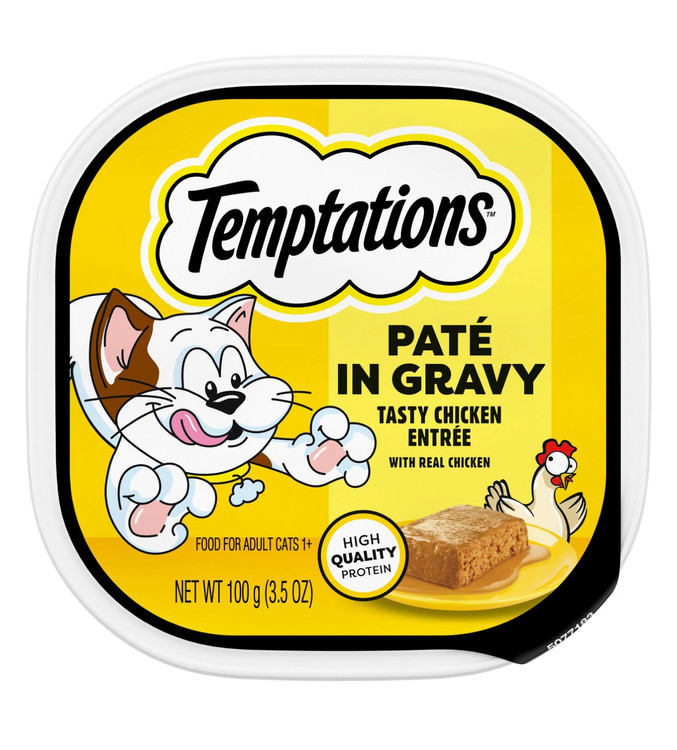 غذای مرطوب Temptations Tasty Chicken Flavor Pate in Gravy یک وعده غذایی لذیذ و خوشمزه است که گربه شما عاشق آن خواهد شد. این پاته خوشطعم با مرغ واقعی تهیه شده و در سسی غنی و خوشعطر سرو میشود. این غذای نرم به رژیم غذایی گربه شما رطوبت اضافه کرده و او را هیدراته نگه میدارد. دستور پخت آن با پروتئین باکیفیت ساخته شده تا از عضلات قوی و سالم حمایت کند. هر وعده شامل ۳۵ ویتامین و ماده معدنی ضروری است که سیستم ایمنی گربه شما را تقویت میکند. بستهبندی کاربردی آن سرو غذا را آسان کرده و دورریز را به حداقل میرساند.