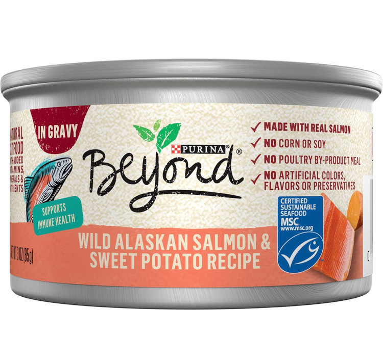• غذای کنسرو شده گربه با پروتئین بالا، تهیهشده از سالمون وحشی آلاسکا از ماهیگیری دارای گواهی MSC