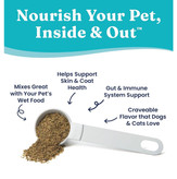 • حمایت از پوست و مو: این مکملها دارای 60 ماده معدنی، 12 ویتامین، 22 اسید آمینه، امگا 3 و بذر کتان هستند تا از پوست سالم و موی نرم حیوان خانگی شما بهخوبی حمایت کنند.
