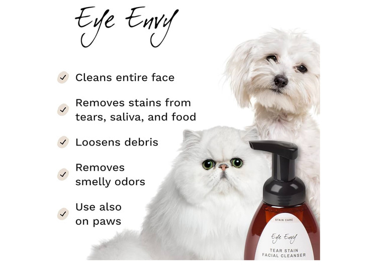 • مرحله 1 از سیستم سهمرحلهای: پاککننده صورت Eye Envy Tear Stain بهآرامی باقیماندههای خشکشده و ترشحات چشم را با این فوم طبیعی شستوشو میدهد. فرمول بدون سوزش با 30PPM نقره کلوئیدی به کنترل لکههای اشک و ریش کمک میکند.