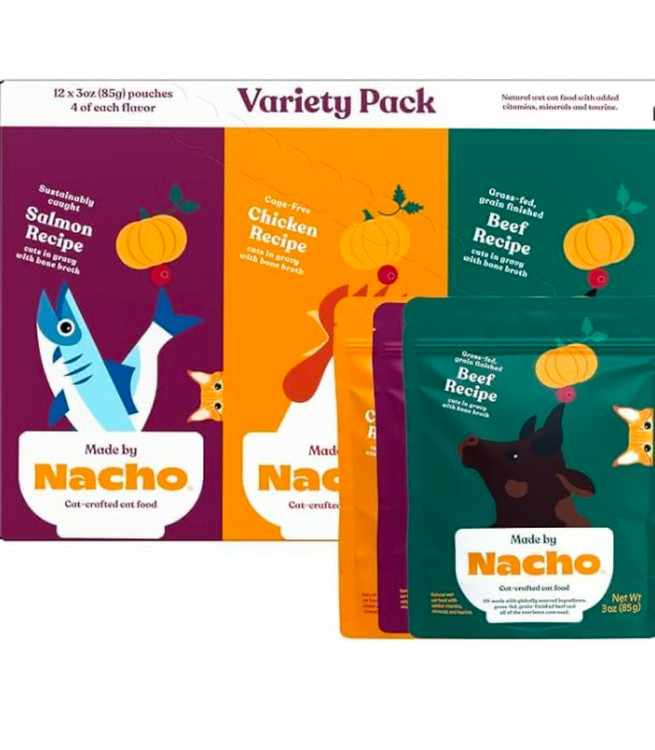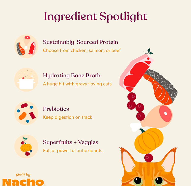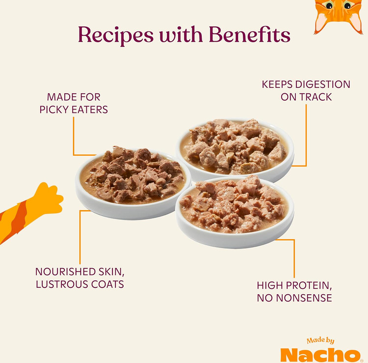 • تولید شده توسط ناچو و بابی فلی: هر دستور غذایی ترکیبی از طعمها و بافتهایی است که گربهها عاشقشان هستند، همراه با مواد اولیه تأیید شده توسط سرآشپز و متخصص تغذیه.