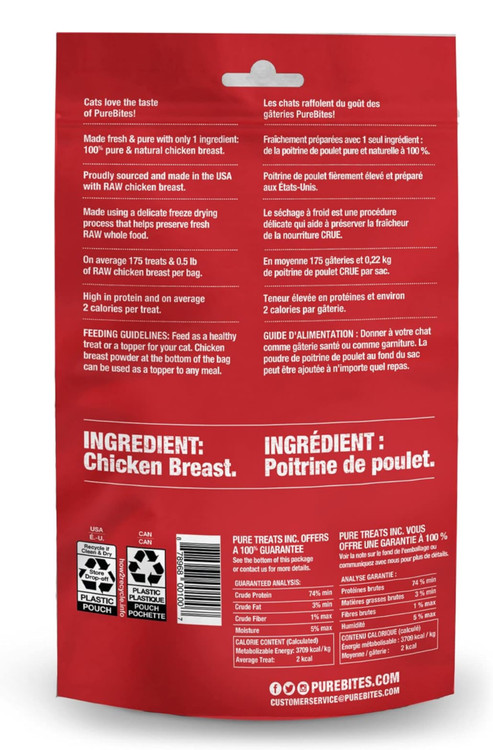 • مواد اولیه ما را بررسی کنید! ساخته شده با تنها یک ماده ساده و با کیفیت انسانی: ۱۰۰٪ سینه مرغ خالص؛ با افتخار از آمریکا تأمین شده و به صورت خام فریز-خشک شده؛ یک میانوعده یا افزودنی عالی و با ارزش برای گربه شما.
