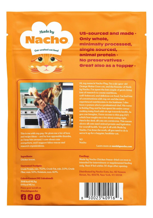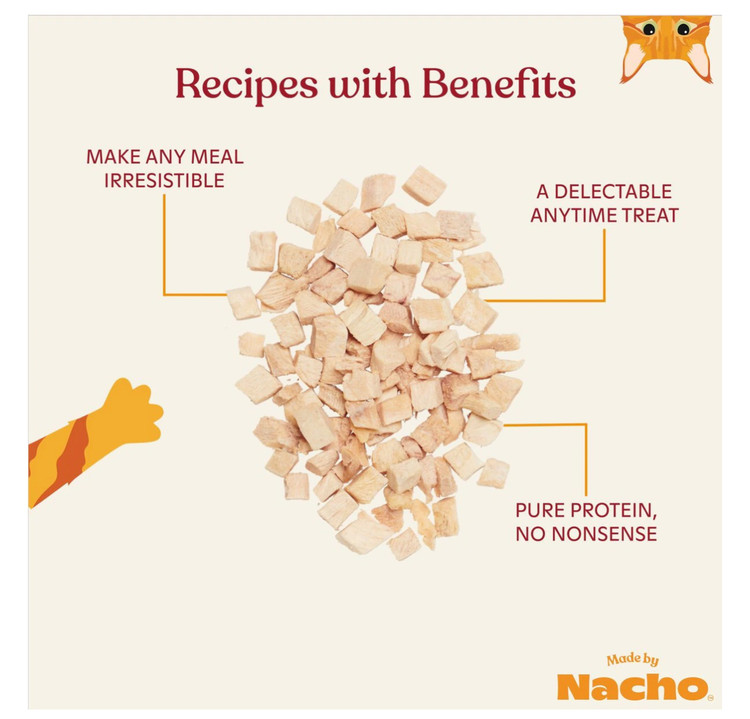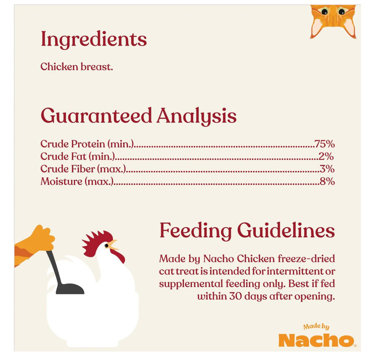 با خوراکیهای سینه مرغ فریز-خشکشده Made by Nacho، گربه پادشاه خود را با تکههای خوشمزه، باکیفیت و مغذی شاد کنید. این خوراکیهای خوشمزه که در آمریکا تهیه و تولید شدهاند، حاوی مرغ خوشطعم و بدون قفس هستند که با حداقل فرآوری از طریق فریز-خشک، طعمهای دلپذیر و مواد مغذی سالم را حفظ کردهاند. سرشار از پروتئین حیوانی کامل، این خوراکیها بدون رنگ و طعم مصنوعی تولید شدهاند و فاقد هورمونها و آنتیبیوتیکهای اضافی هستند. این میانوعدههای ساده و سالم میتوانند بهعنوان یک تزئین خوشمزه و بافتدار برای وعدههای روزانه گربه شما نیز استفاده شوند. کافی است این خوراکیها را به گربه پادشاه خود ارائه دهید تا با طعم فوقالعاده آنها، رضایت او را جلب کنید!