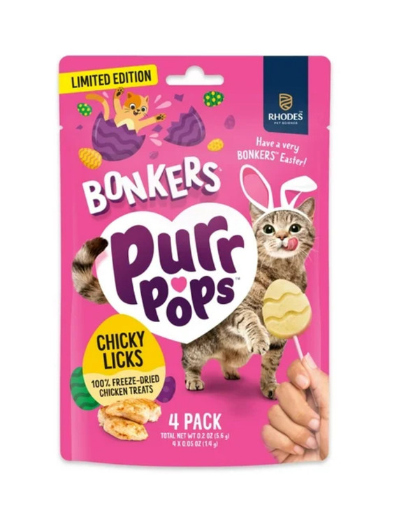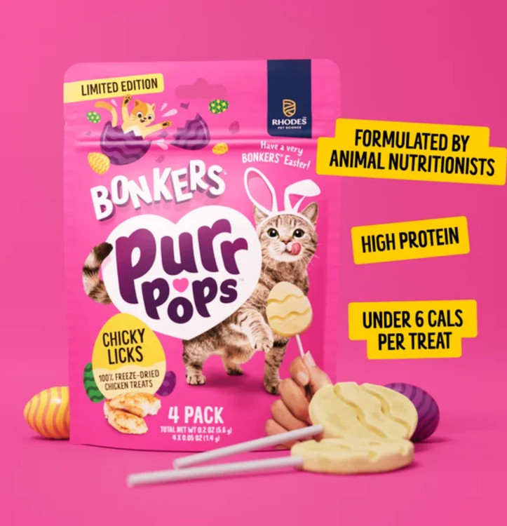 این بهار، گربه خود را با BONKERS Purrpops، یک آبنبات لیسیدنی مخصوص گربه با طعم مرغ، در شکل خاص و محدود تخممرغی برای عید پاک، شگفتزده کنید.