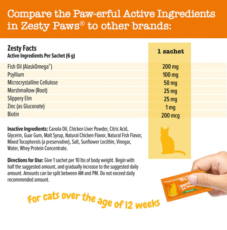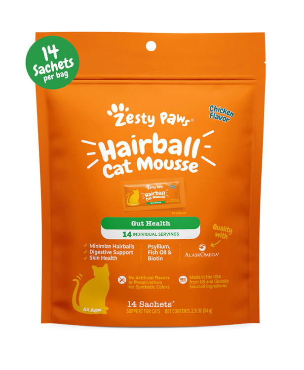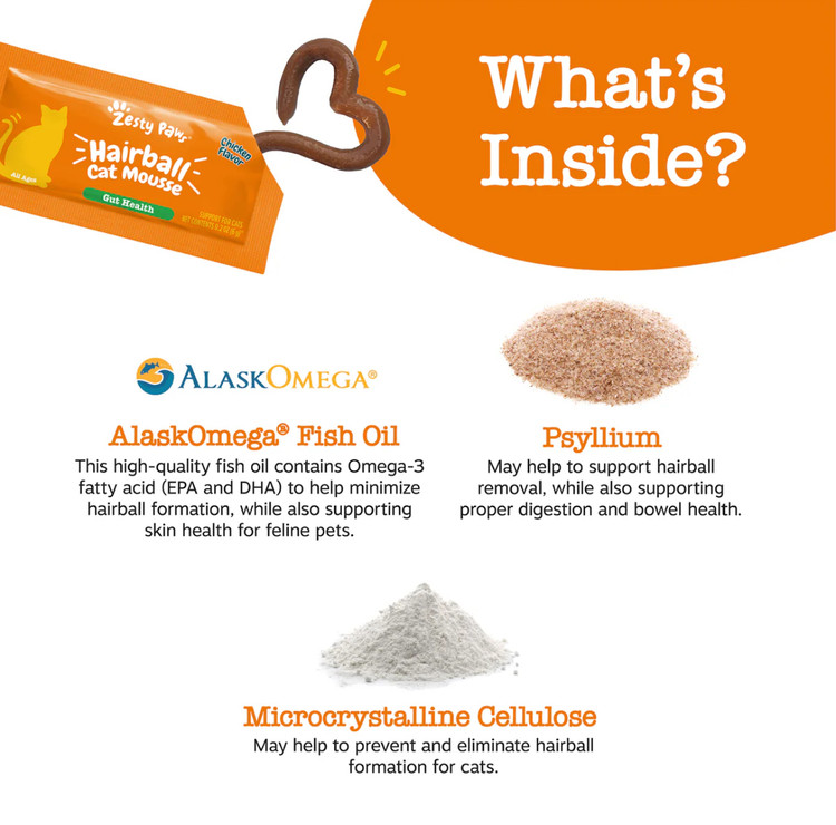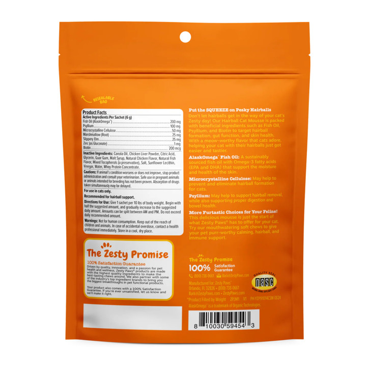 موس ضد هیربال گربه Zesty Paws با ترکیبی از روغن ماهی آلاسکا (AlaskOmega) غنی از اسیدهای چرب امگا، پسیلیوم، میکروکریستالین سلولز، نارون لغزنده (Slippery Elm)، و بیوتین تهیه شده. این ترکیب منحصربهفرد، به کاهش و پیشگیری از تشکیل گلولههای مویی، بهبود عملکرد گوارش و سلامت پوست کمک میکنه. تازه، با طعمی که گربهها عاشقشن، دیگه کمک به گربهات برای مقابله با هیربال هم آسون شده، هم خوشمزه!
