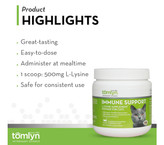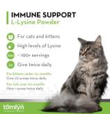 Tomlyn L-Lysine Immune Support یک پودر خوشطعم با طعم افرا برای گربهها و بچهگربههای در تمامی سنین است. این محصول با کیفیت دامپزشکی توسط ما تولید شده تا از سیستم ایمنی گربهها و بچهگربهها حمایت کند و به حفظ عملکرد طبیعی تنفسی، سلامت چشم و سیستم ایمنی قوی کمک کند.