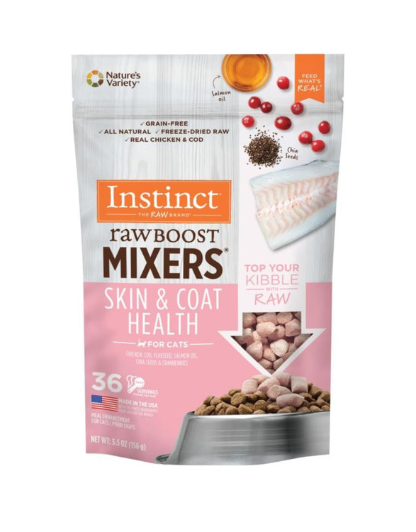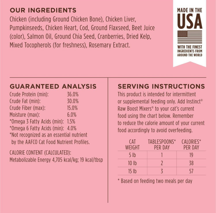 با Instinct Raw Boost Mixers که حاوی مرغ بدون قفس بهعنوان ماده اصلی است، غذای گربه خود را غنی کنید. این محصول سرشار از پروتئین حیوانی است که برای حفظ سلامت پوست و مو ضروری است.