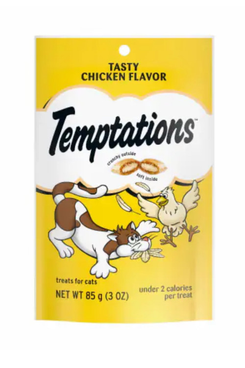 - بسته ۸۵ گرمی (۳ اونس): شامل یک (۱) بسته ۸۵ گرمی از تشویقی کلاسیک Temptations با طعم مرغ خوشمزه است