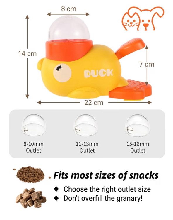 • توصیه: دیسپنسر خوراکی مدل اردک ابعادی برابر با ۲۲ در ۱۴ سانتیمتر (۸.۶ در ۵.۵ اینچ) دارد. مناسب برای سگها و گربههای کوچک تا متوسط.