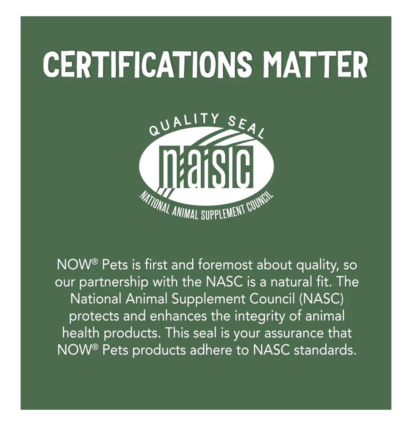 NOW Pets توسط شورای مکملهای حیوانی آمریکا (NASC) تأیید شده است؛ سازمانی که با ارتقای سلامت حیوانات غیربرای مصرف غذایی و نظارت بر کیفیت مکملها، به حفظ ایمنی و سلامت محصولات حیوانی کمک میکند.
