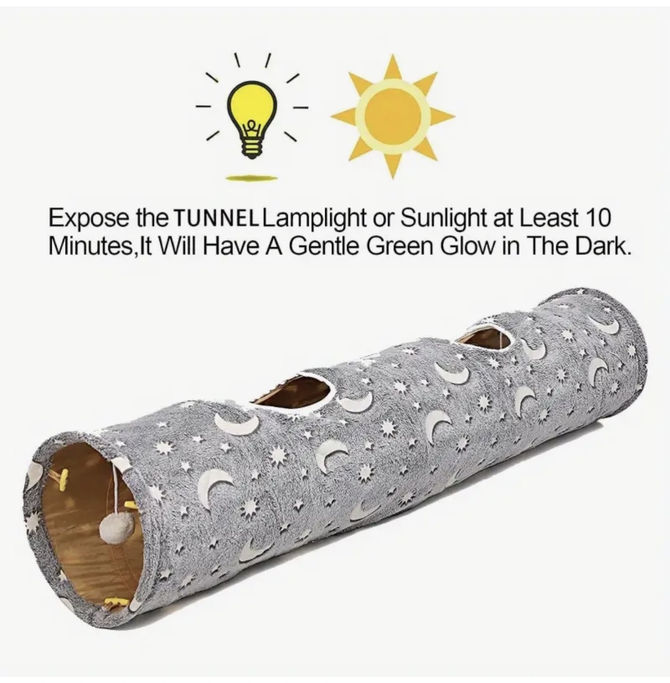 تونل گربه شبتاب با توپهای پولیشی – تونل بازی تاشو و فوتولومینسانس برای گربهها، خرگوشها، بچهگربهها و تولهسگها – طرح ماه و ستاره طوسی، طول 116.89 سانتیمتر – سرگرمی پت