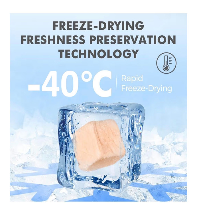 • 【تازگی منجمد خشک شده در -40°C】 – با استفاده از فرآیند منجمد خشک کردن در دمای بسیار پایین -40 درجه سانتیگراد، طعم، عطر و مواد مغذی گوشت تازه حفظ میشود و هر لقمه هم خوشمزه و هم مغذی است.
