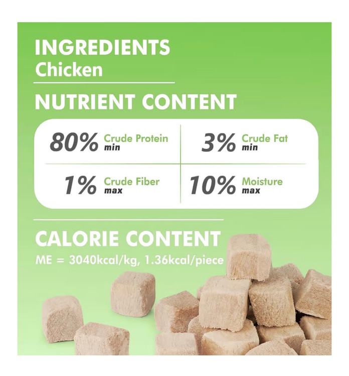 • 【تکماده خالص】 – این تشویقیهای سگ و گربه منجمد خشک شده، با 100٪ مرغ باکیفیت تهیه شدهاند و فقط شامل یک ماده هستند. بدون افزودنی، بدون غلات، بدون نگهدارنده – فقط گوشت طبیعی و خالص که میتوانید به آن اعتماد کنید.