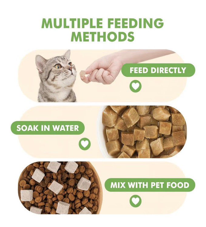 • 【تشویقی چندمنظوره و مکمل غذایی】 – مناسب به عنوان جایزه آموزشی سالم، میانوعده روزانه، یا روی غذا برای افزایش طعم و ارزش غذایی. میتوانید مستقیماً سرو کنید، با آب بازسازی کنید یا روی وعده غذایی بپاشید.