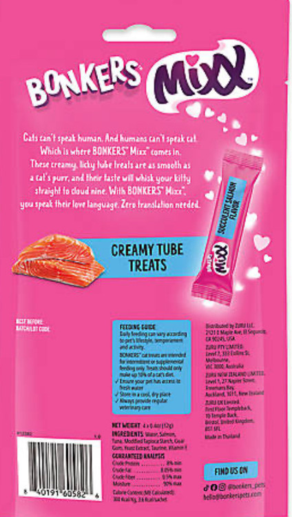 گربه خود را با BONKERS Mixx Succulent Salmon با طعم لوله لیسیدن پذیرایی کنید. گربه ها نمی توانند با انسان صحبت کنند. و انسان ها نمی توانند گربه صحبت کنند. اینجاست که BONKERS Mixx وارد میشود. این خوراکیهای خامهای و لبنی که با گوشت واقعی ساخته شدهاند، مانند خرخر گربهها صاف هستند - و طعم آنها گربهتان را مستقیماً به حالت ابری در میآورد. با غذاهای دستی BONKERS Mixx، به زبان عشق آنها صحبت می کنید. نیاز به ترجمه صفر است